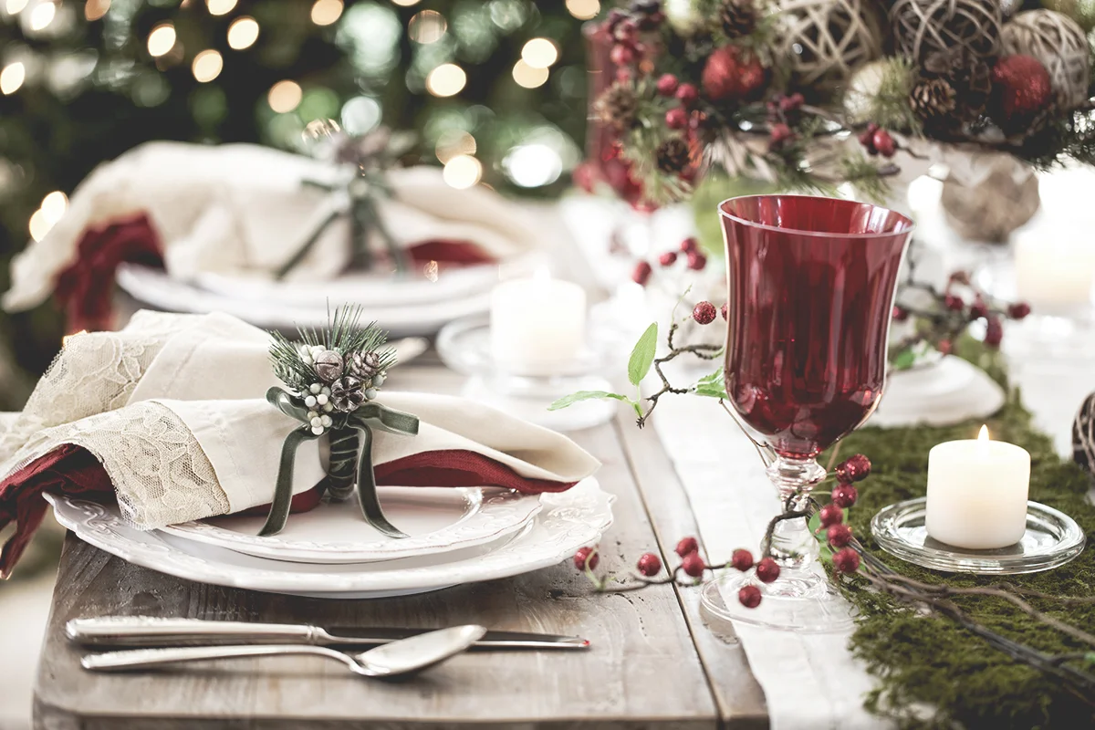Uppdukning av bord, stol, servett, blomma, ljus, juldekor, samt porslin