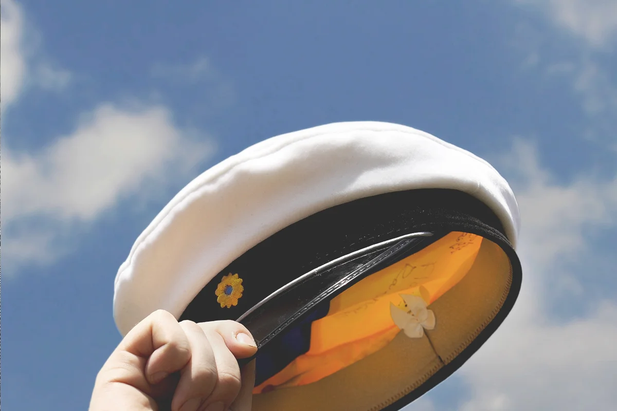 Studenttårta med text (MLK, ÄGG, GLU) (Vit prinsesstårta formad som en studentmössa)